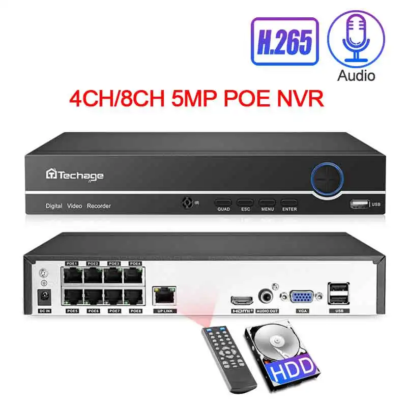 Techage 4CH 8CH H.265 4MP 5MP 1080P POE NVR Security Surveillance Network Audio Out Video Recorder